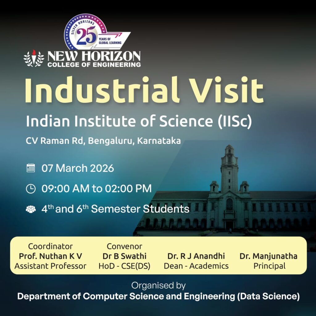 CO-CURRICULAR ACTIVITIES industrial visit to the Indian Institute of Science, Bengaluru The Department of Computer Science and Engineering (Data Science) at New Horizon College of Engineering organized an industrial visit on 07 March 2026 to the Indian Institute of Science, Bengaluru, for 4th and 6th semester students from 09:00 AM to 02:00 PM. The visit […]