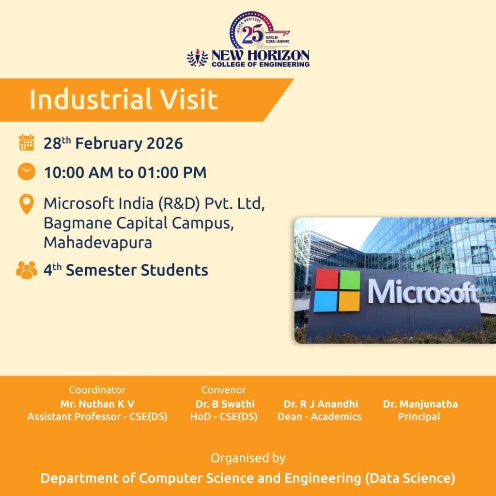 CO-CURRICULAR ACTIVITIES industrial visit to Microsoft India (R&D) Pvt. Ltd The industrial visit to Microsoft India (R&D) Pvt. Ltd., held on 28 February 2026 at Bagmane Capital Campus, was organized by the Department of Computer Science and Engineering (Data Science), New Horizon College of Engineering, for 4th semester students. Conducted from 10:00 AM to 01:00 […]