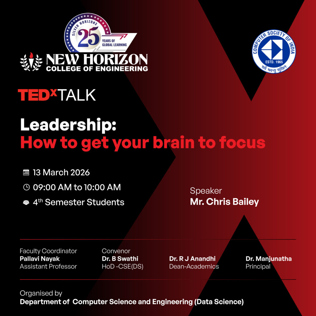 CO-CURRICULAR ACTIVITIES TEDx Talk – “How to Get Your Brain to Focus The Department of Computer Science and Engineering (Data Science), New Horizon College of Engineering, organized a TEDx Talk viewing session titled “How to Get Your Brain to Focus” for students. The session featured Chris Bailey, a productivity expert and author, who shared valuable […]